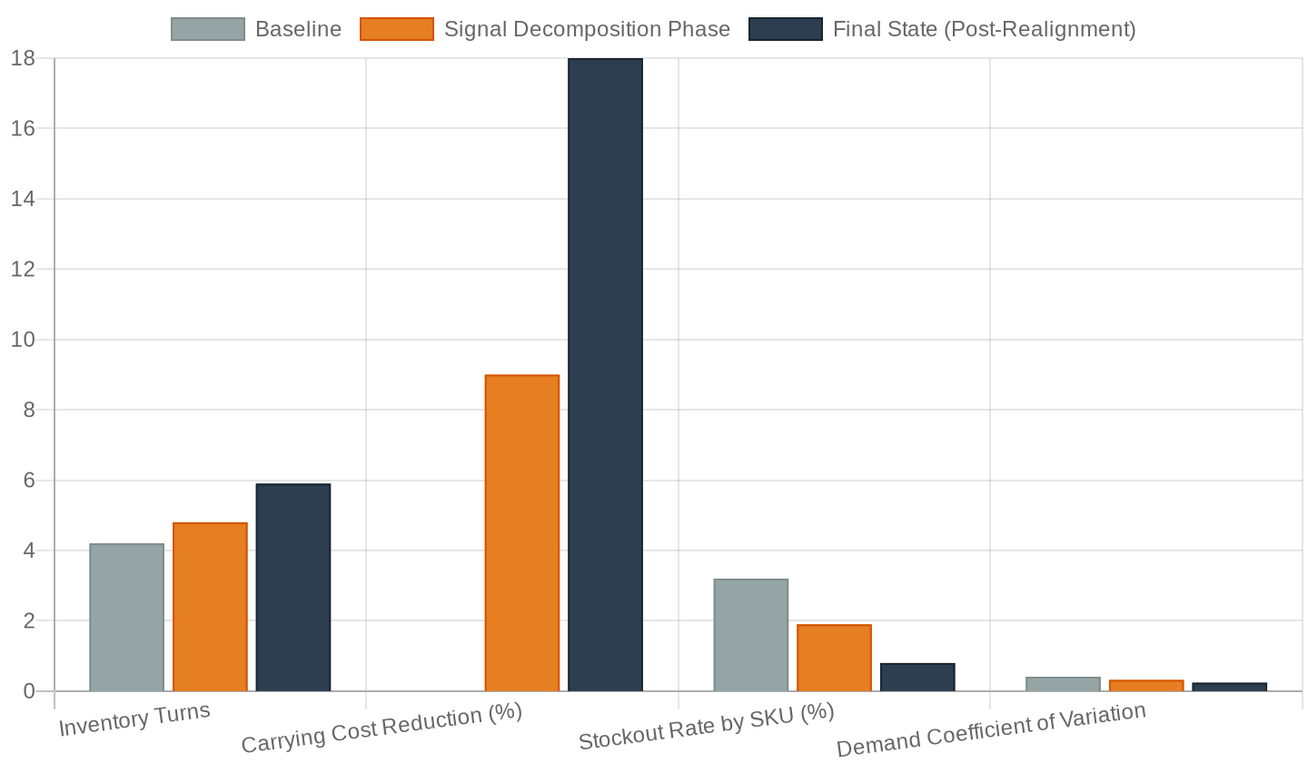 Mid-sized automotive parts supplier, ~280 people. Inventory turns were 4.2x annually—industry median is 6.8x for their segment. They claimed demand was 'too volatile.' Initial audit showed their 12-month demand CV (coefficient of variation) at 0.41. Looked random. Dug into forecast history: their demand planners were using a 6-month rolling average with zero adjustment for known seasonal ramps tied to OEM production cycles. Actual demand without internal forecast lag had CV of 0.24. We rebuilt their baseline demand input, adjusted safety stock formulas from 2.8 weeks to 1.9 weeks of buffer, and trained the team on signal/noise separation. Within 6 months, turns improved to 5.9x, carrying costs dropped 18%, and stockouts declined from 3.2% to 0.8% of SKUs. The volatility didn't change. Their visibility did.